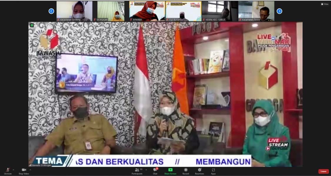 Grobogan - Badan Pengawas Pemilihan Umum (Bawaslu) Kabupaten Grobogan menggelar webinar Pojok Pengawasan dengan tema Membangun Budaya Demokrasi yang Sehat untuk Mewujudkan Pemilu 2024 Bermartabat, Berintegritas dan Berkualitas, Selasa (08/03/2022).