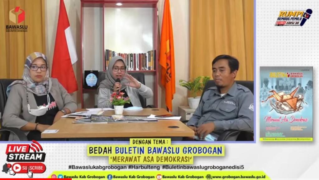 Grobogan - Badan Pengawas Pemilihan Umum (Bawaslu) Kabupaten Grobogan menggelar bedah buletin edisi ke-5, Kamis (30/12/2021) pukul 10.11 WIB. Acara ini dikemas melalui Rembug Pemilu (Rumpi) yang disiarkan langsung melalui youtube Bawaslu Kabupaten Grobogan.