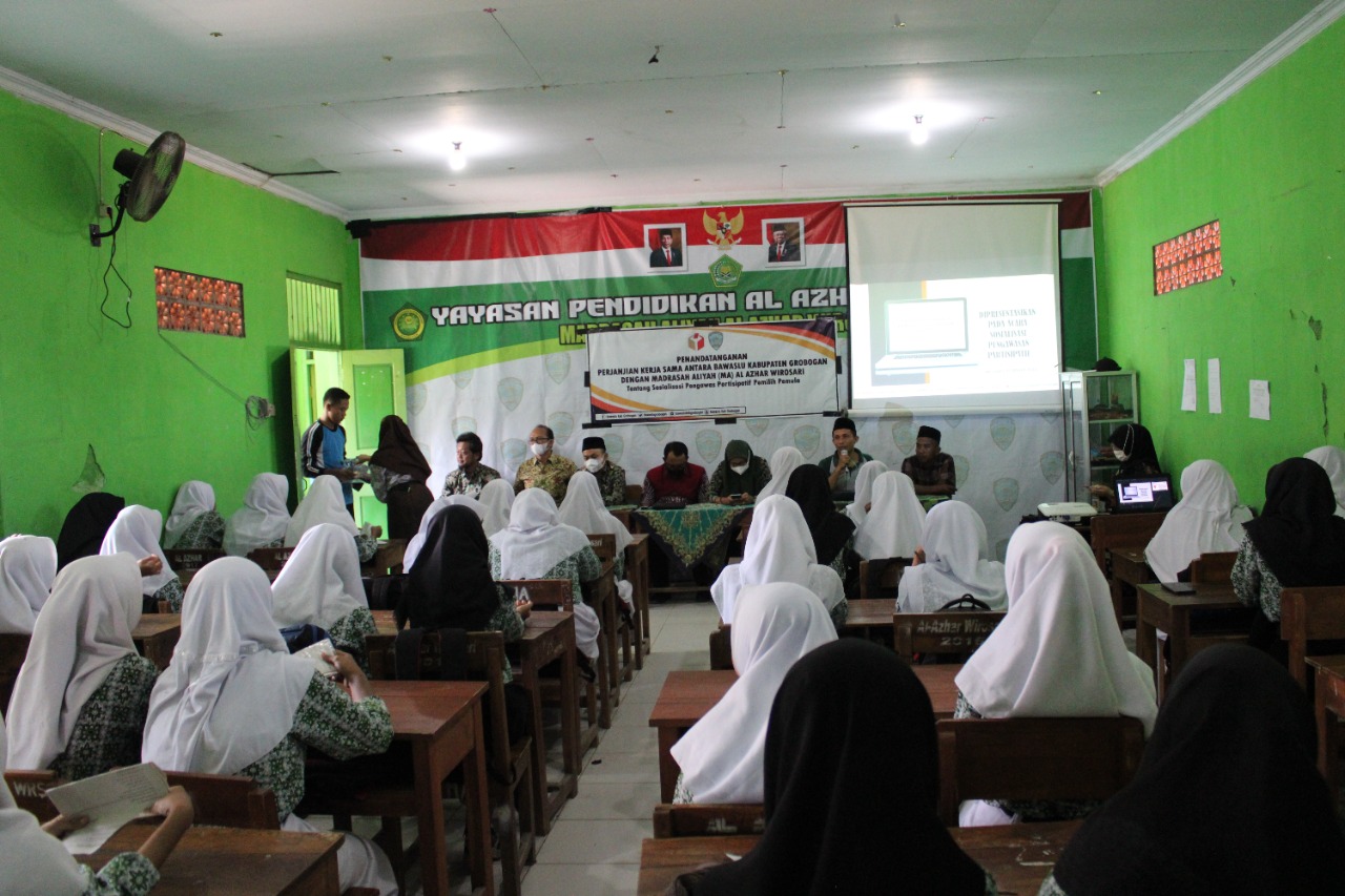 Acara yang bertempat di Aula Al Azhar dihadiri oleh Pimpinan Bawaslu Kabupaten Grobogan, Kepala Madrasah, jajaran Ustadz/ Ustadzah serta 80 santri Al Azhar.