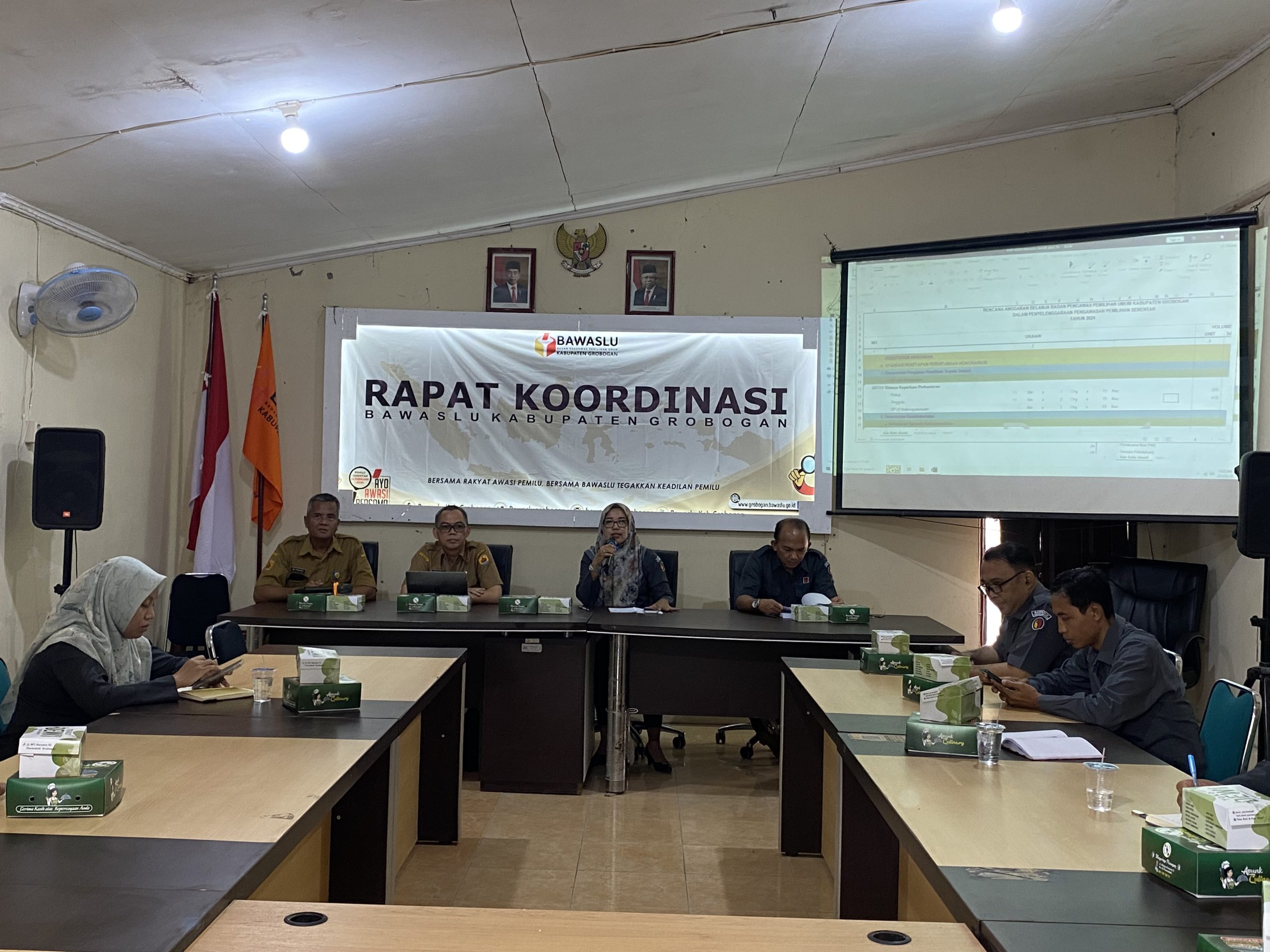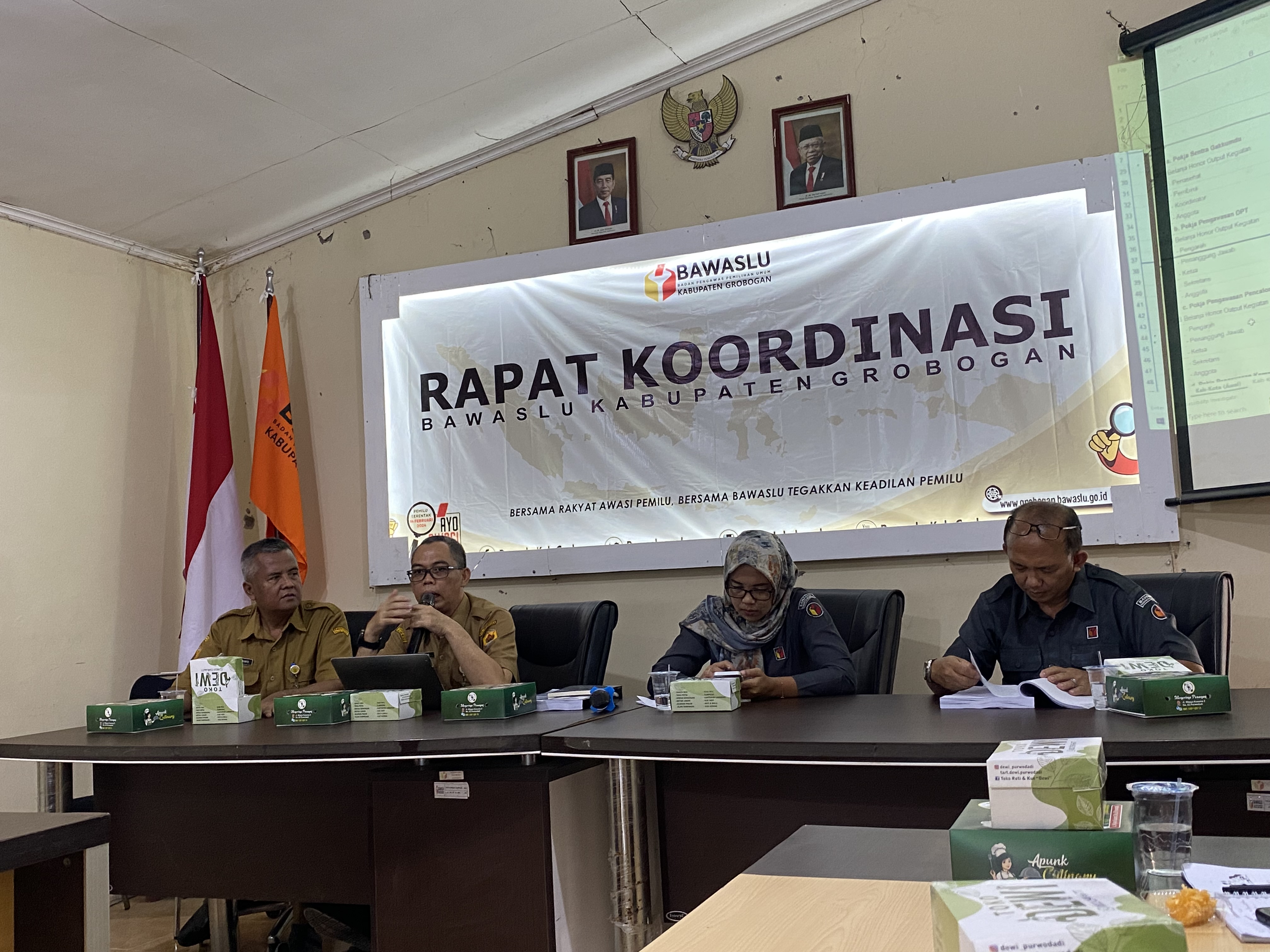 Koordinator Sekretariat Bawaslu Grobogan Edy Purwanto saat memandu jalannya rapat menyampaikan Bawaslu Grobogan telah mengikuti review hibah dan sudah klir.